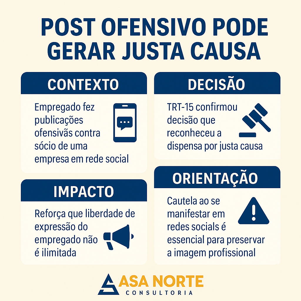 Post ofensivo em rede social pode gerar justa causa: entenda a decisão do TRT-15 Fonte original: ConJur — conteúdo adaptado para fins informativos. Resumo executivo da decisão do TRT-15 sobre justa causa por ofensas em rede social. A decisão recente do TRT-15 confirmou a dispensa por justa causa de empregado que publicou ofensas direcionadas a […]