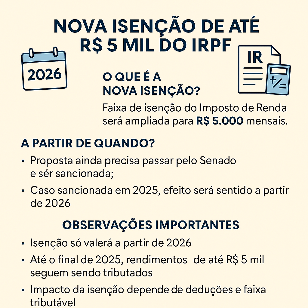 Nova isenção de até R$ 5 mil no IRPF: quando começa a valer? Entenda o que muda com a ampliação da faixa de isenção do IRPF para até R$ 5.000 mensais, quando passa a valer e como isso pode aparecer no seu contracheque. Infográfico: principais pontos da nova isenção do IRPF. O Plenário da Câmara […]