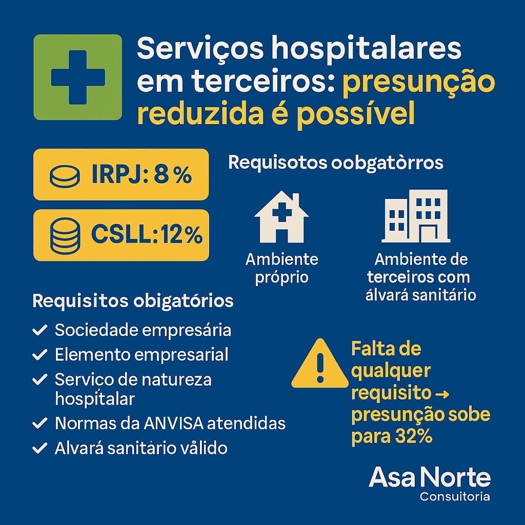 Receita autoriza presunção reduzida para serviços hospitalares prestados em terceiros Base legal: Parecer SEI nº 7.689/2021/ME e Solução de Consulta Disit/SRRF nº 6.032/2025 A Receita Federal esclareceu que serviços hospitalares prestados em ambientes de terceiros podem aplicar os percentuais reduzidos de presunção no Lucro Presumido, desde que cumpridos requisitos empresariais e sanitários específicos. De acordo […]